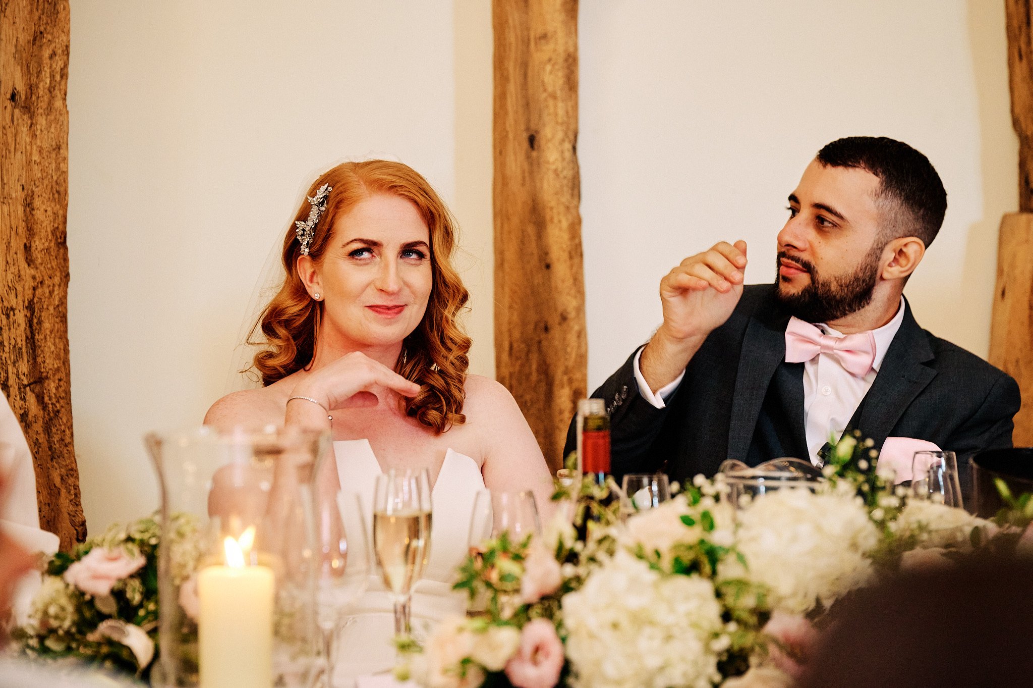 The ancient tithe barn was lit by warm white fairy lights and round iron candle chandeliers dressed with the same beautiful flowers as the wedding temple. Matching florals also adorned the tables with fresh whites, greens, and blush pink continuing Katherine’s elegant colour scheme.